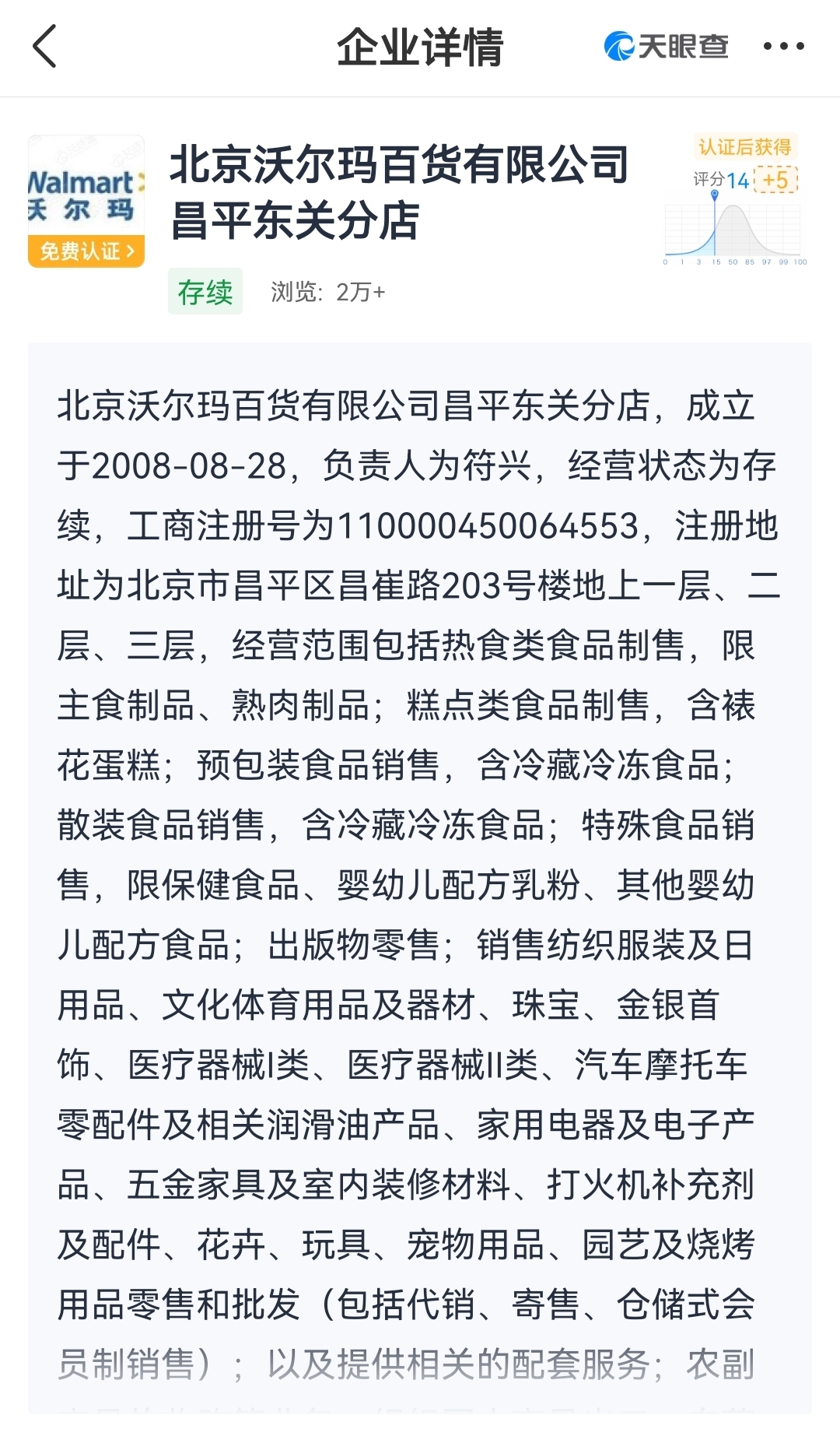 另外,根据天眼查信息,北京沃尔玛百货有限公司昌平东关分店,成立于2008年,负责人是符兴。