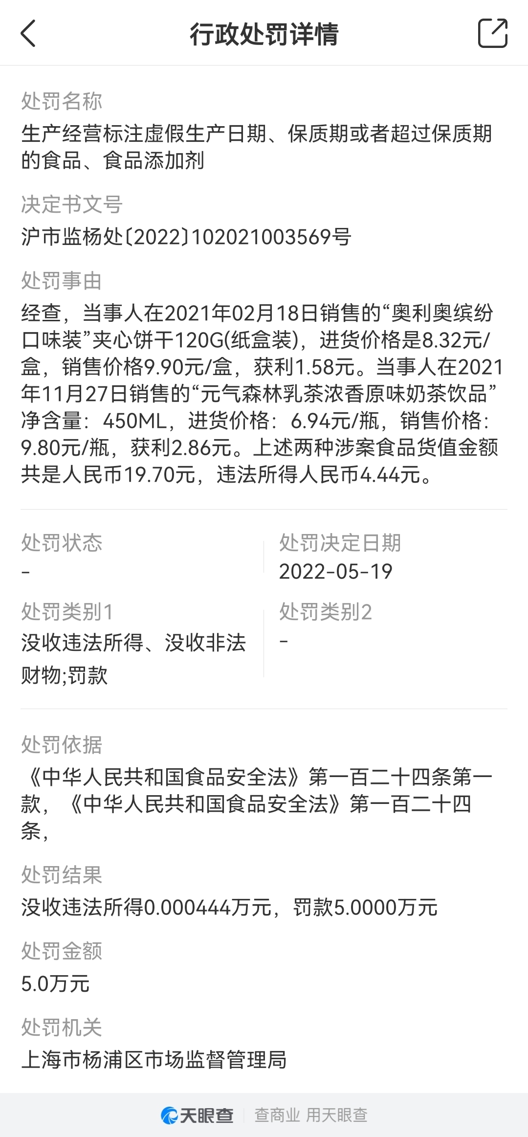 处罚事由显示,当事人此前销售的“奥利奥缤纷口味装”夹心饼干和“元气森林乳茶浓香原味奶茶饮品”超过保质期,违反了食品安全法。处罚结果为没收违法所得0.000444万元,罚款5万元。处罚单位为上海市杨浦区市场监督管理局。