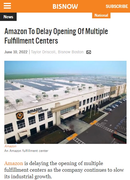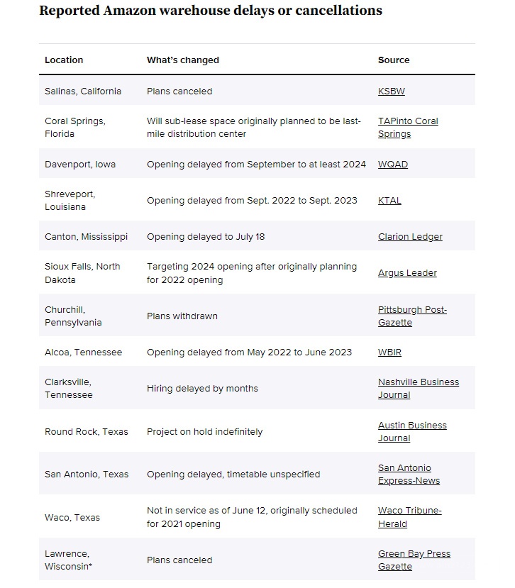 7月1日消息,2022年亚马逊已经推迟或取消了至少13个配送中心的开设,在德克萨斯州、佛罗里达州、路易斯安那州、田纳西州和加利福尼亚州等地的仓库受到影响。