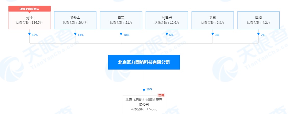 据天眼查不完全信息统计,成立至今,北京瓦力网络科技有限公司仅对外投资成立一家公司,即北京飞思动力网络科技有限公司,后者的法定代表人为詹旭敏。目前,该公司经营状态为注销。