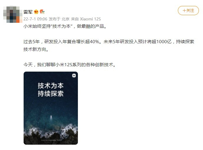 值得一提的是,今日早间,小米董事长雷军在个人微博发文表示,小米始终坚持“技术为本”,做最酷的产品。过去5年,研发投入年复合增长超40%。未来5年研发投入预计将超1000亿,持续探索技术新方向。