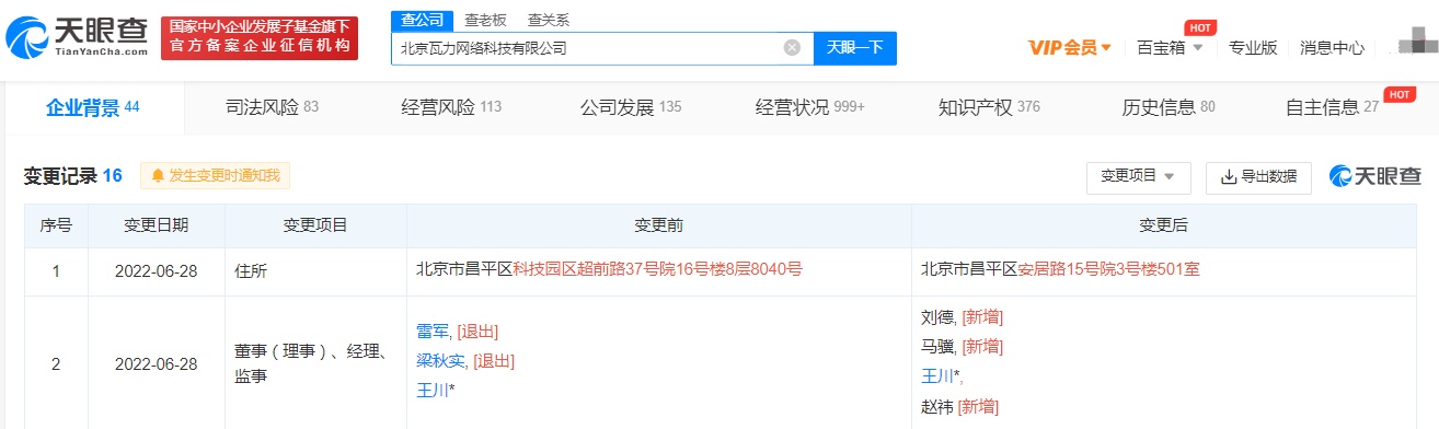 7月1日消息,天眼查信息显示,近日,小米互娱关联公司北京瓦力网络科技有限公司发生工商变更,雷军卸任执行董事职务,梁秋实卸任监事职务,新增刘德、马骥、赵祎三名高管人员。