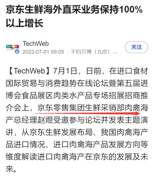 7月1日消息,日前,在进口食材国际贸易与消费趋势在线论坛暨第五届进博会食品展区肉类水产品专场招展招商推介会上,京东零售集团生鲜采销部肉禽海产总经理赵煜受邀参与论坛并发表主题演讲。