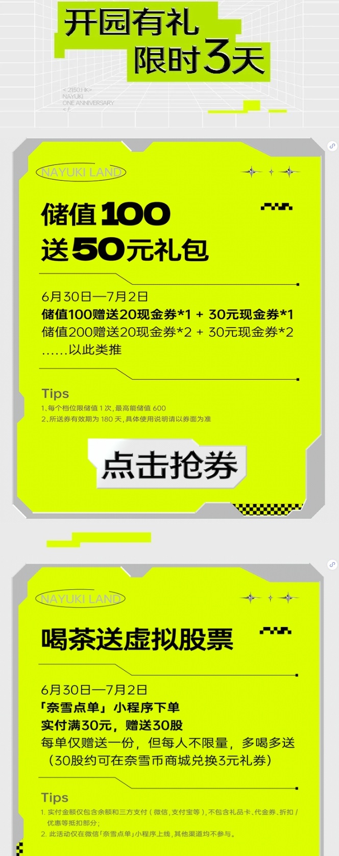 从6月30日至7月2日,用户储值100赠送1张20元现金券,以及1张30元现金券;储值200赠送2张20元现金券,以及2张30元现金券……以此类推。用户在“奈雪的茶”小程序下单,实付满30元,赠送30股,30股约可在奈雪币商城兑换3元礼券。每单仅赠送1份,但每人不限量。