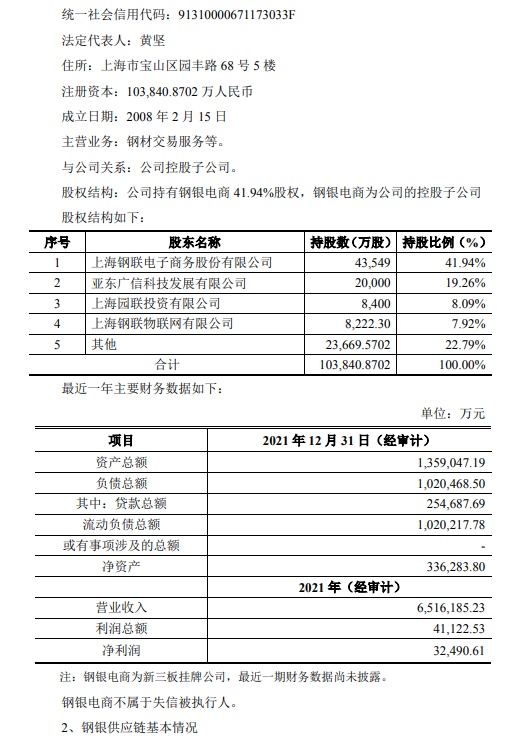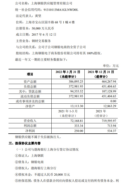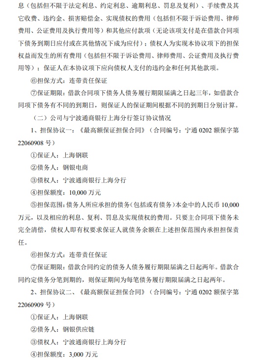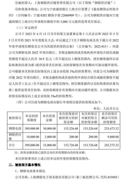 公告显示,公司于2022年4月13日召开的第五届董事会第十八次会议和2022年5月5日召开的2021年年度股东大会,审议通过了《关于钢银电商及其下属公司2022年度申请授信额度及公司为其提供担保的议案》,同意公司为钢银电商2022年度向银行、非银金融机构或其他机构申请综合授信或融资额度不超过人民币38.9亿元(在不超过以上额度范围内,授信额度最终以实际核准的结果为准)提供连带责任担保,该担保额度在有效期内可滚动循环使用,公司根据本次担保实际情况向上述企业收取5‰的担保费用;同意公司为钢银供应链2022年度向银行、非银金融机构或其他机构申请综合授信或融资额度不超过人民币1亿元(在不超过以上额度范围内,授信额度最终以实际核准的结果为准)提供连带责任担保,该担保额度在有效期内可滚动循环使用,公司根据本次担保实际情况向上述企业收取5‰的担保费用。