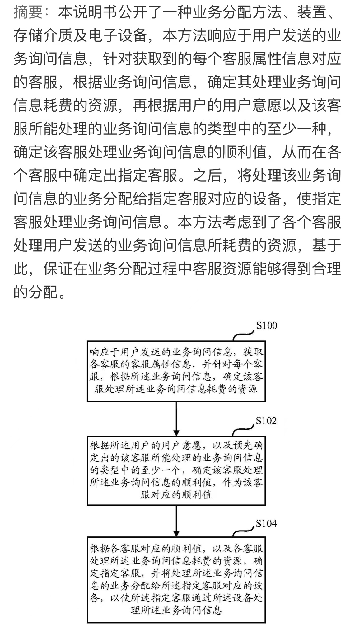 该专利摘要显示,本说明书公开了一种业务分配方法、装置、存储介质及电子设备,本方法响应于用户发送的业务询问信息,针对获取到的每个客服属性信息对应的客服,根据业务询问信息,确定其处理业务询问信息耗费的资源,再根据用户的用户意愿以及该客服所能处理的业务询问信息的类型中的至少一种,确定该客服处理业务询问信息的顺利值,从而在各个客服中确定出指定客服。之后,将处理该业务询问信息的业务分配给指定客服对应的设备,使指定客服处理业务询问信息。本方法考虑到了各个客服处理用户发送的业务询问信息所耗费的资源,基于此,保证在业务分配过程中客服资源能够得到合理的分配。