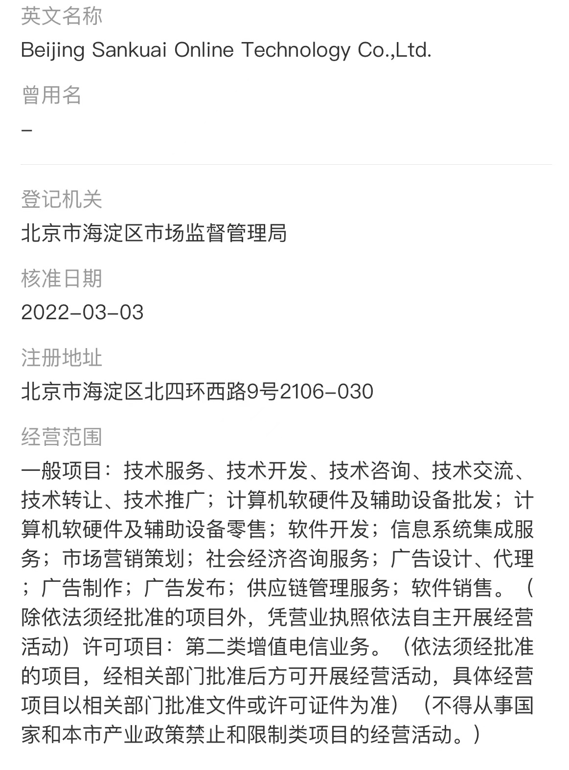 天眼查资料显示,北京三快在线科技有限公司成立于2011年5月,注册资本413166万美元,法定代表人为穆荣均,公司经营范围包括计算机软件技术、网络技术开发;技术转让、技术服务、技术咨询;计算机系统集成;企业营销策划;经济贸易咨询;销售自行开发的软件产品;批发计算机硬件及其配套设备;基础软件服务;应用软件服务;设计、制作、代理、发布广告;供应链管理。