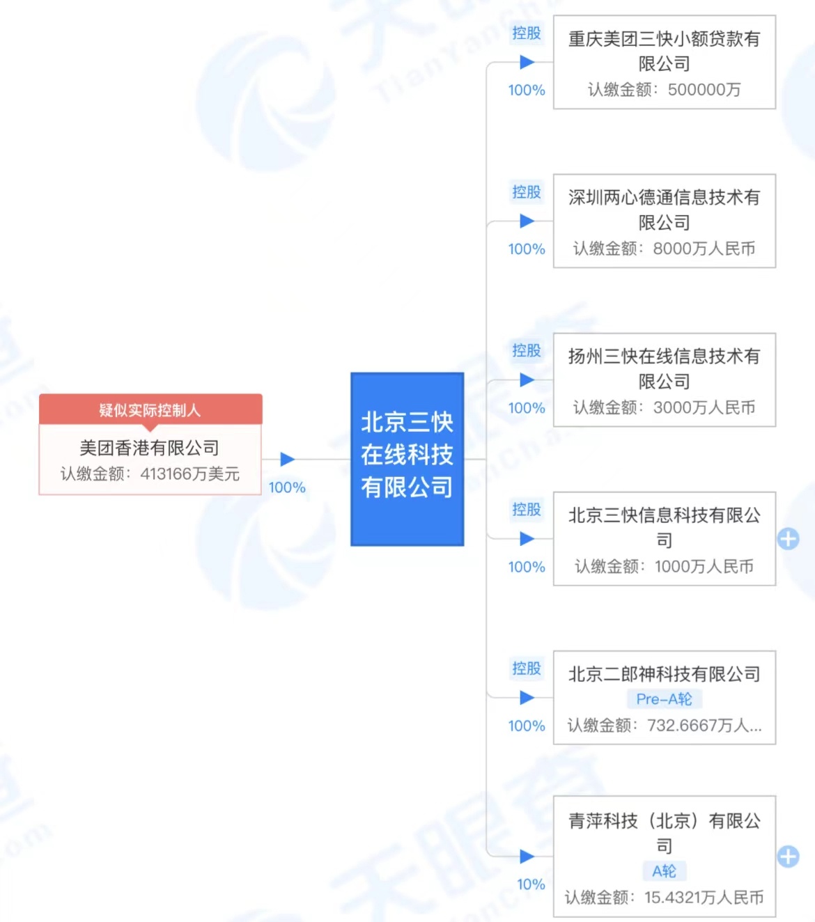 股权穿透图显示,北京三快在线科技有限公司由美团香港有限公司100%全资持股,认缴金额为413166万美元。