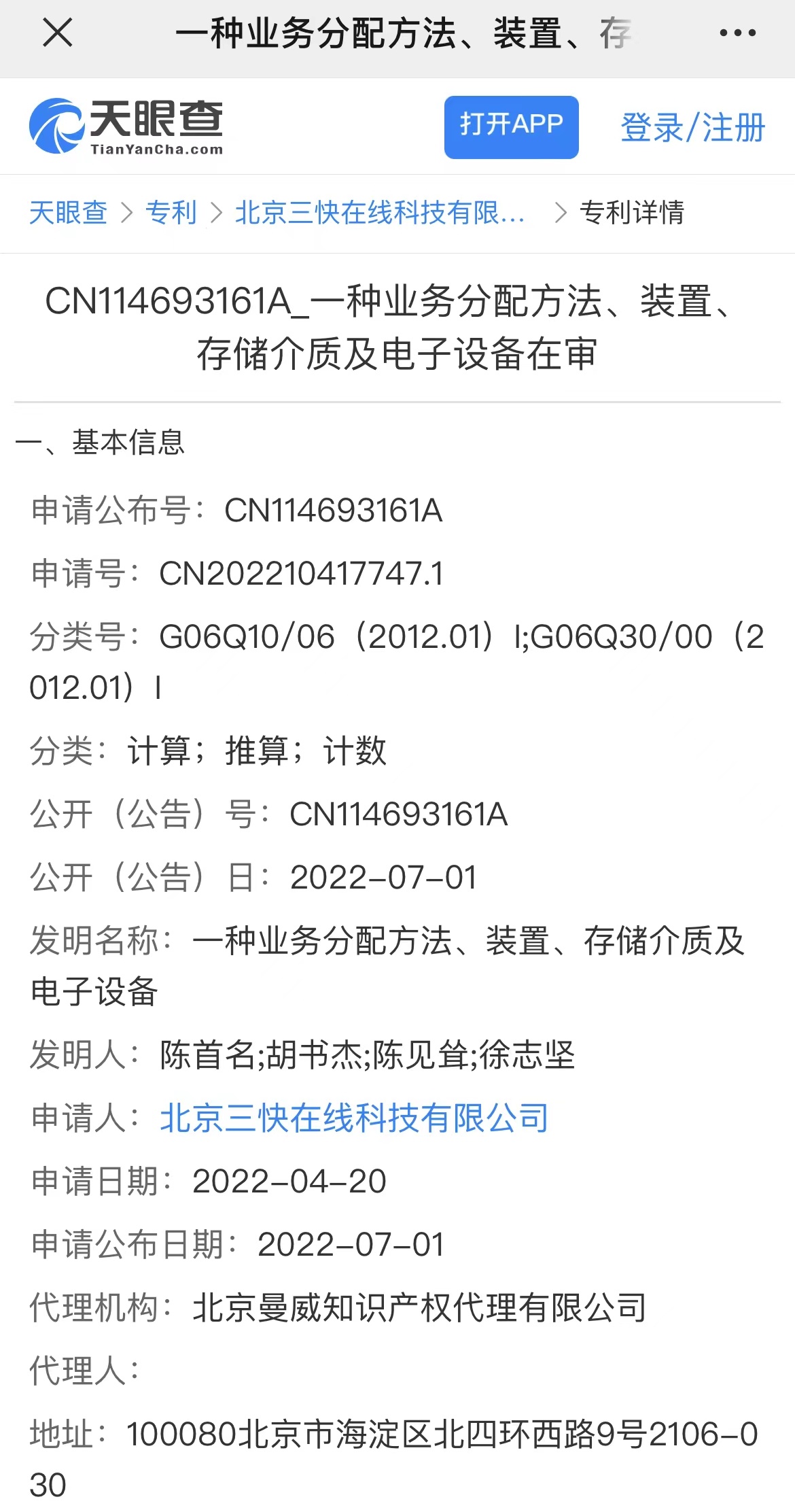 7月1日消息,天眼查资料显示,美团关联公司北京三快在线科技有限公司7月1日公开一项“一种业务分配方法、装置、存储介质及电子设备”专利,申请公布号为CN114693161A,申请日期为2022年4月20日。