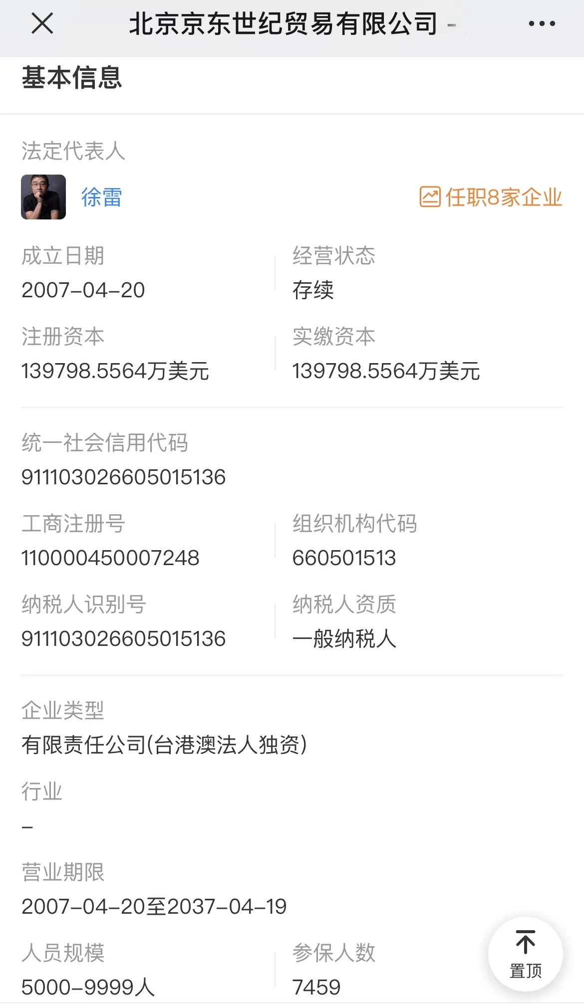 天眼查资料显示,北京京东世纪贸易有限公司成立于2007年4月,注册资本139798.5564万美元,法定代表人为徐雷,公司经营范围包括计算机、软件及辅助设备、机械设备、家用电器、电子元器件、五金交电、电子产品、文化用品、照相器材、化妆品及卫生用品、化工产品(不含危险化学品及一类易制毒化学品)、体育用品、百货、邮票、纺织品、服装、日用品、家具、金银珠宝首饰、避孕器具(避孕药除外)、新鲜水果、蔬菜、食盐、饲料、花卉、种子、装饰材料、通讯设备、建筑材料、工艺礼品、钟表眼镜、玩具、汽车和摩托车配件、机器人、仪器仪表、卫生洁具、陶瓷制品、橡胶及塑料制品、摩托车、智能卡、化肥、农药、牲畜(不含北京地区)的批发、佣金代理(拍卖除外)、零售、进出口及代理进出口业务等。
