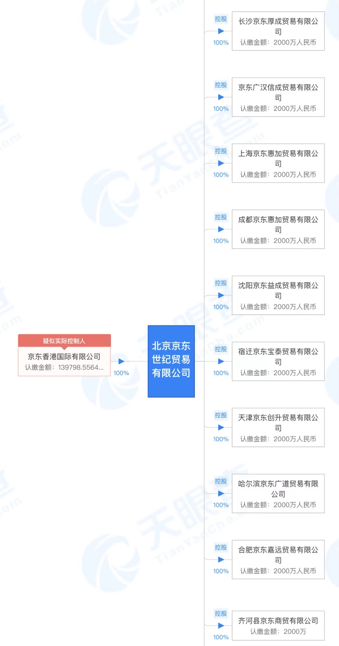 股权穿透图显示,北京京东世纪贸易有限公司由京东香港国际有限公司100%全资持股,认缴金额为139798.5564万美元。
