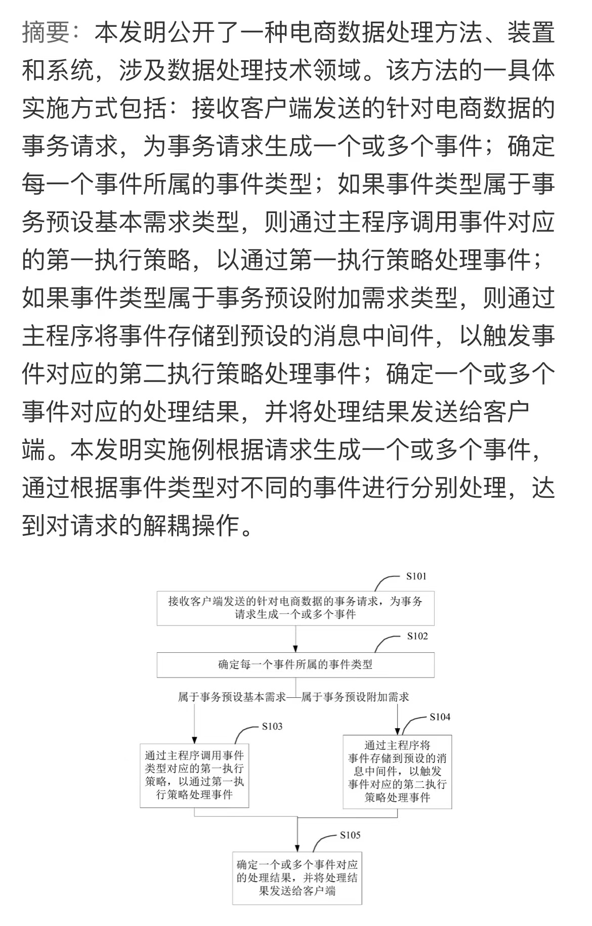 该专利摘要显示,本发明公开了一种电商数据处理方法、装置和系统,涉及数据处理技术领域。该方法的一具体实施方式包括:接收客户端发送的针对电商数据的事务请求,为事务请求生成一个或多个事件;确定每一个事件所属的事件类型;如果事件类型属于事务预设基本需求类型,则通过主程序调用事件对应的第一执行策略,以通过第一执行策略处理事件;如果事件类型属于事务预设附加需求类型,则通过主程序将事件存储到预设的消息中间件,以触发事件对应的第二执行策略处理事件;确定一个或多个事件对应的处理结果,并将处理结果发送给客户端。本发明实施例根据请求生成一个或多个事件,通过根据事件类型对不同的事件进行分别处理,达到对请求的解耦操作。