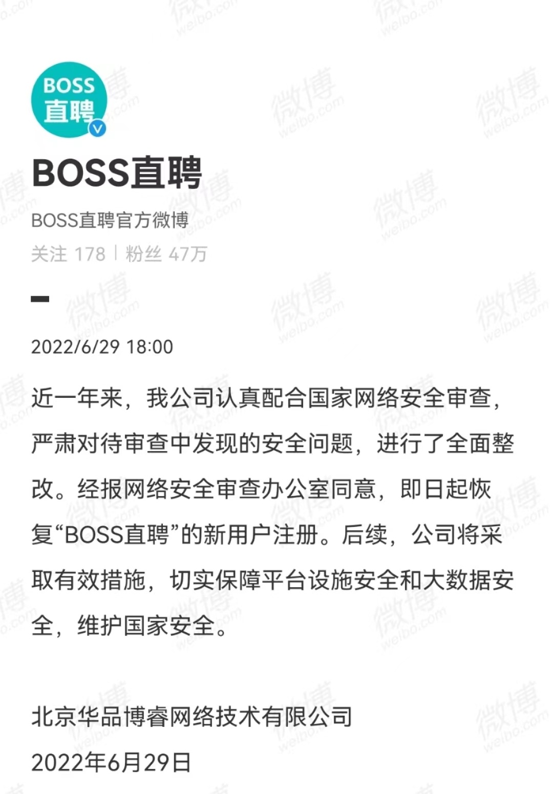 经报网络安全审查办公室同意,即日起恢复“BOSS直聘”的新用户注册。后续,BOSS将采取有效措施,切实保障平台设施安全和大数据安全,维护国家安全。