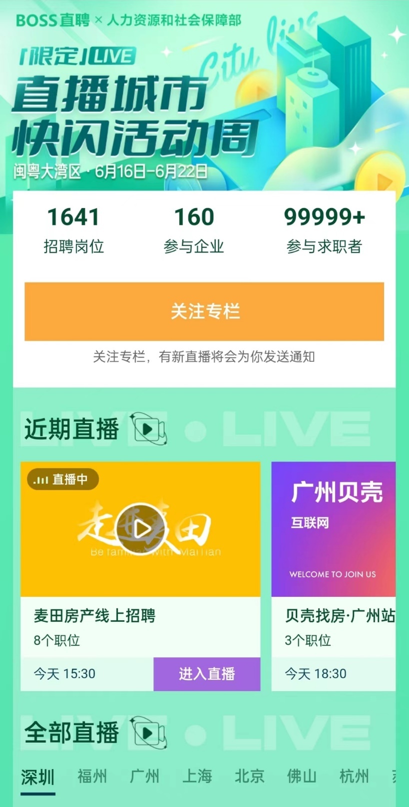 据了解,为鼓励企业释放招聘需求,促进大湾区人才充分就业,BOSS直聘平台方也为参与企业提供支持,雇主可在活动期内免费进行1次直播校招和直播社招。