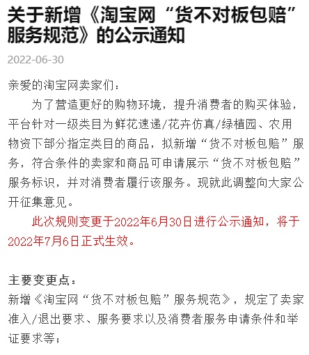 7月1日消息,日前,淘宝网新增《淘宝网“货不对板包赔”服务规范》。公告显示,淘宝平台针对一级类目为鲜花速递/花卉仿真/绿植园、农用物资下部分指定类目的商品,拟新增“货不对板包赔”服务,符合条件的卖家和商品可申请展示“货不对板包赔”服务标识,并对消费者履行该服务。该规则将于2022年7月6日正式生效。