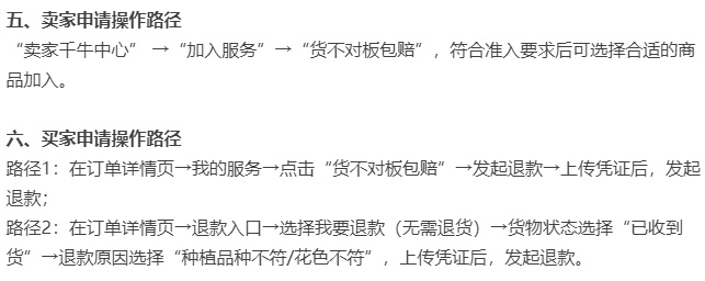 在卖家要求上,卖家须同时符合以下条件,可选择“鲜花速递/花卉仿真/绿植园艺”和“农用物资”一级类目下指定开放类目的商品加入“货不对板包赔”服务,具体要求以“货不对板包赔”入驻页面为准。若退出服务的,则卖家在服务存续期间产生的订单仍须履行相应服务承诺。