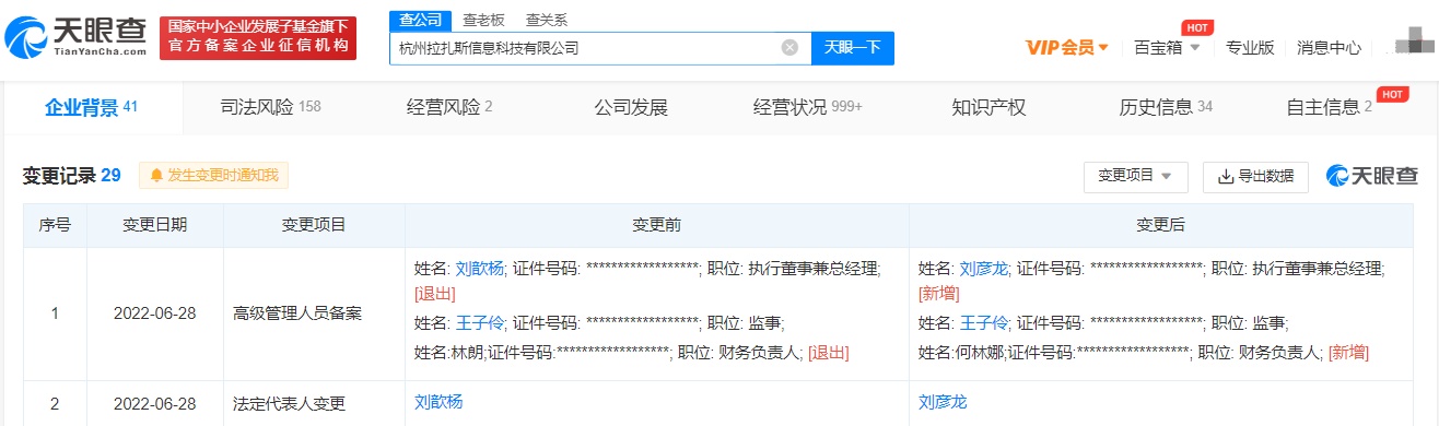 7月1日消息,天眼查信息显示,近日,饿了么关联公司杭州拉扎斯信息科技有限公司发生工商变更,刘歆杨卸任法定代表人、执行董事兼总经理,由刘彦龙接替。