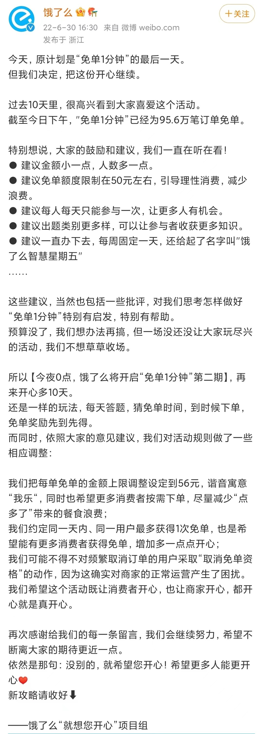 值得一提的是,日前,饿了么通过官方微博发布消息称,原计划6月30日结束的“免单1分钟”活动继续,将开启“免单1分钟”第二期,为期10天。截至6月30日下午,“免单1分钟”已经为95.6万笔订单免单。