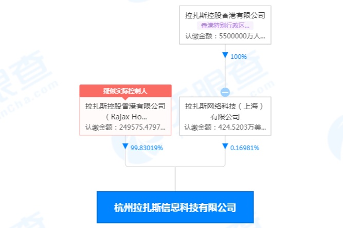 股权穿透图显示,该公司由拉扎斯控股香港有限公司(Rajax Holding(HK)Limited)、拉扎斯网络科技(上海)有限公司共同持股,持股比例分别约为99.83%、0.17%。