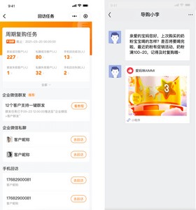 导购回访:针对已添加企微的客户,商家可以开启导购回访任务,让导购人员通过企业微信回访客户,使用统一的营销话术,咨询客户商品实际使用情况,查看客户的历史购买记录,并为客户更准确的推荐复购商品。