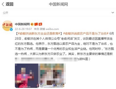 此前,新东方在线董事会主席俞敏洪在个人社交平台发文称,东方甄选以卖农产品为主,是要建一个优秀的农业和生活产业链。要建立一个立体化销售平台,为更多的中国商家服务。这个立体化销售平台,除抖音外,还会考虑其他平台,甚至自建平台。这需要培养更多的主播,挑选更多的优秀人才,自建产品体系。会做东方甄选严选,出产更多的东方甄选牌产品。