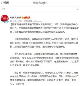 而在4月11日,在河南保税物流中心园区内,我国首单跨境电商零售进口药品在“全球汇”线上平台完成实单交易,标志着国家跨境电商零售进口药品试点业务正式启动。