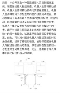 该专利摘要显示,本公开涉及一种配送机器人及货物配送系统,该配送机器人包括底座、机器人主体和转动机构,机器人主体和转动机构均安装在底座上,机器人主体具有用于与配送站的窗口接驳的承载台,转动机构用于驱动机器人主体绕Z向轴线相对于底座转动,以将承载台转动至与窗口相接驳的预设位置,机器人主体上设置有光发射模块和感光模块中的一者,用于与设置在配送站上的光发射模块和感光模块中的另一者配合,以确定承载台是否位于预设位置。如此,可以减小配送机器人与配送站接驳时的角度偏差,提高了接驳的精度,能够保证配送机器人与配送站接驳的可靠性,保证货物在配送机器人与配送站之间的正常传送。而且,还有利于降低成本和简化配送机器人的结构。