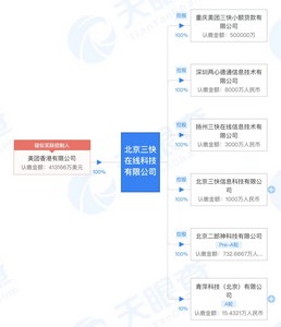 股权穿透图显示,北京三快在线科技有限公司由美团香港有限公司100%全资持股,认缴金额为413166万美元。