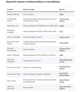 值得一提的是,2022年以来,亚马逊据悉已经推迟或取消了至少13个配送中心的开设,在德克萨斯州、佛罗里达州、路易斯安那州、田纳西州和加利福尼亚州等地的仓库受到影响。