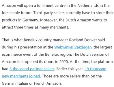 荷兰版亚马逊于2020年首次开业。当时,该平台拥有5000名合作卖家。今年早些时候,有1.9万新商户加入。这些卖家比德国、意大利或法国亚马逊上的卖家多。