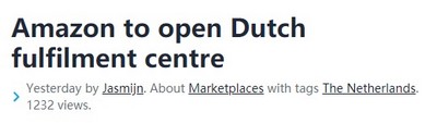 近日,Amazon.nl宣布了一个针对荷兰卖家的单独页面。根据之前的研究,该平台仅有2%的商家来自荷兰。大多数来自中国(60%),其次是德国(11%)。因此,市场看到了荷兰电子商务企业家的增长潜力。Donker表示,借助亚马逊,他们可以轻松地进行跨境销售。亚马逊的翻译软件应该能进一步适应这一点。