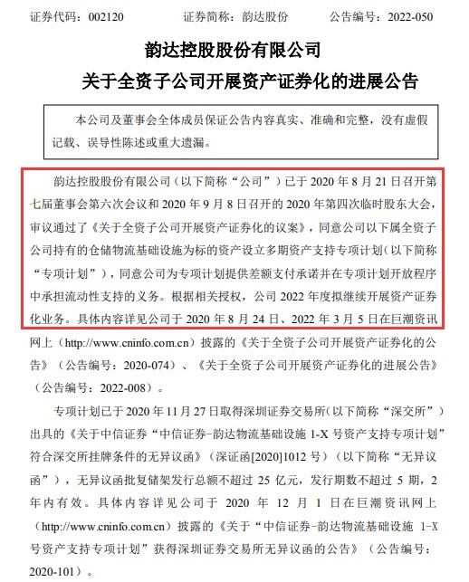 公告称,公司已于2020年8月21日召开第七届董事会第六次会议和2020年9月8日召开的2020年第四次临时股东大会,审议通过了《关于全资子公司开展资产证券化的议案》,同意公司以下属全资子公司持有的仓储物流基础设施为标的资产设立多期资产支持专项计划(以下简称专项计划),同意公司为专项计划提供差额支付承诺并在专项计划开放程序中承担流动性支持的义务。