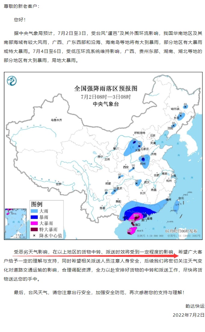7月3日消息,日前,韵达快运发布关于台风天气告客户书(以下简称“公告”)。