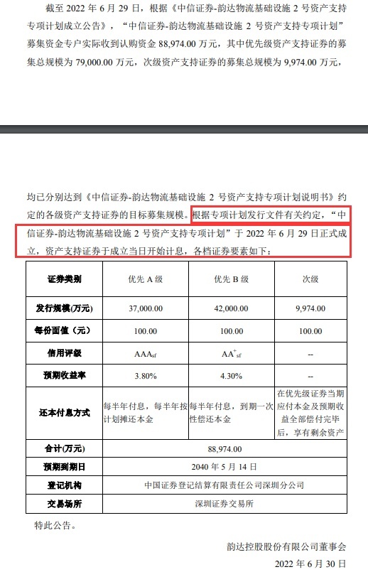 根据专项计划发行文件有关约定,“中信证券-韵达物流基础设施2号资产支持专项计划”于2022年6月29日正式成立,资产支持证券于成立当日开始计息。
