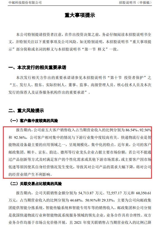 2019~2021年,中邮科技前五大客户销售收入占当期营业收入的比例分别为86.54%、92.56%和92.56%。2021年前五名客户顺丰、中国邮政集团、京东、德邦、广州立瑞汽车销售额占比分别为49.27%、29.33%、10.88%、1.61%、1.48。在此之前,中邮科技的最大客户是中国邮政集团。