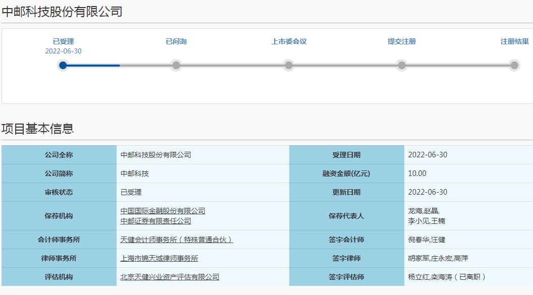 7月2日消息,中邮科技股份有限公司(以下简称中邮科技)科创板IPO于6月30日获上交所受理,中国国际金融股份有限公司和中邮证券有限责任公司联合保荐。公司拟公开发行不超过3400万股,拟募资10亿元。