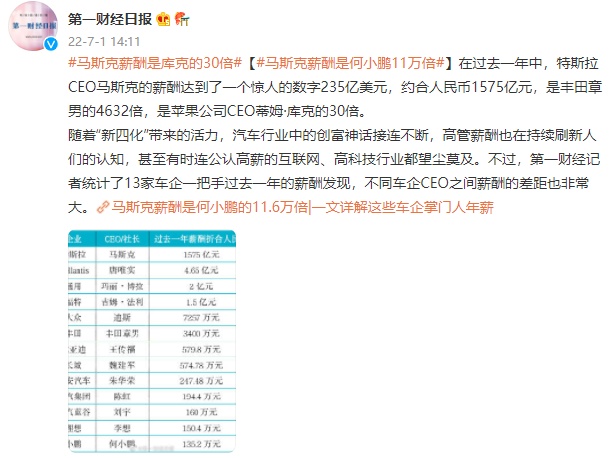 另外,据第一财经消息,在过去一年中,特斯拉CEO马斯克的薪酬达到了235亿美元,约合人民币1575亿元,是丰田章男的4632倍,是苹果公司CEO蒂姆·库克的30倍。
