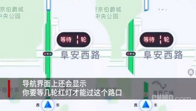 在某些城市路口,用户等红绿灯时,导航上会同步显示红灯倒计时。倒计时仅剩5秒时,语音导航会提示:请注意,红灯即将变绿。如果排队车辆过多,导航还会显示需要等几轮红灯才能通过这个路口。