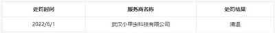 此次公示名单显示,抖音电商于2022年6月1日,对武汉小甲虫科技有限公司予以“清退”处罚。