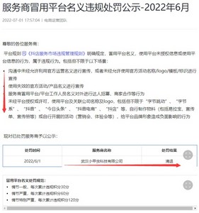 7月3日消息,近日,抖音电商发布了“服务商冒用平台名义违规处罚公示-2022年6月”。
