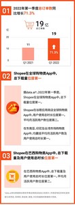 据data.ai数据,2022年第一季度,Shopee在全球购物类App中,总下载量位居第一;在谷歌应用商店全球购物类App中,用户使用总时长位居第一,平均月活跃用户数位居第二;在东南亚、印尼及台湾市场购物类App中,均囊括平均月活跃用户数及用户使用总时长第一。