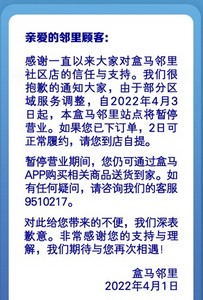 比如,今年3月,被寄予厚望的盒马邻里推出送货上门的新服务,自3月3日上线后,已陆续在7城的1500家自提店内全面铺开。但是仅过去一个月,盒马APP首页就挂出通告,“由于部分区域服务调整,自2022年4月3日,本盒马邻里站点将暂停营业。”