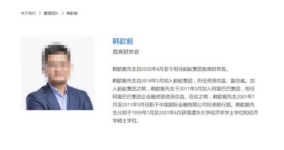 韩歆毅则于2011年9月加入阿里巴巴集团,担任阿里巴巴集团企业融资部资深总监,2014年5月其加入蚂蚁集团,历任资深总监、副总裁,自2020年4月至今担任蚂蚁集团首席财务官。