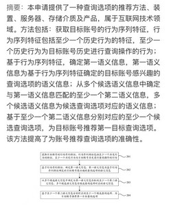 该专利摘要显示,本申请提供了一种查询选项的推荐方法、装置、服务器、存储介质及产品,属于互联网技术领域。方法包括:获取目标账号的行为序列特征,行为序列特征包括至少一个历史行为的特征,至少一个历史行为为目标账号历史进行查询操作的行为;基于行为序列特征,确定第一语义信息,第一语义信息为基于行为序列特征确定的目标账号感兴趣的查询选项的语义信息;从多个候选语义信息中确定与第一语义信息匹配的至少一个第二语义信息,多个候选语义信息为候选查询选项对应的语义信息;基于至少一个第二语义信息分别对应的至少一个候选查询选项,为目标账号推荐第一目标查询选项。该方法提高了为账号推荐查询选项的准确性。