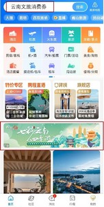 进入携程旅行APP,首页搜索框中搜索“云南文旅消费券”、“云南消费券”等关键词,点击信息流“七彩云南,四季游礼”即跳转至活动页面,或点击首页活动广告进入。