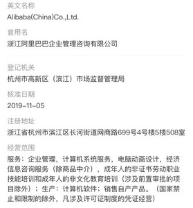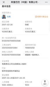 天眼查资料显示,阿里巴巴(中国)有限公司成立于2007年3月26日,法定代表人为张勇,注册资本15298万美元,经营范围包括:企业管理;计算机系统服务;电脑动画设计;经济信息咨询服务;成年人的非证书劳动职业技能培训和成年人的非文化教育培训;生产:计算机软件;销售自产产品。