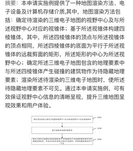 该专利摘要显示,本申请实施例提供了一种地图渲染方法、电子设备及计算机存储介质,其中,地图渲染方法包括:确定待渲染的三维电子地图的视野中心及与所述视野中心对应的视锥体;基于所述视锥体构建四棱锥体,其中,所述四棱锥体的顶点与所述视锥体的顶点相同,所述四棱锥体的底面为平行于所述视锥体的远裁剪面的矩形,所述矩形的中心为所述视野中心;确定所述三维电子地图包含的地理要素中与所述四棱锥体产生碰撞的建筑物作为待隐藏地理要素;渲染所述待渲染的三维电子地图时,使所述待隐藏地理要素不可见。通过本申请实施例,可有效保证视野中心信息的清晰呈现,提升三维地图呈现效果和用户体验。
