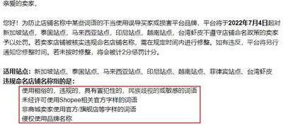 日前,Shopee还发布公告称,平台于2022年7月4日起对不遵守店铺命名政策的卖家予以处罚。