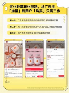 另外,使用“商品访问量”,优化种草转化链路,从广告主“加量”到用户“购买”只需三步。第一步:广告主选择想要投放的商品笔记,投放薯条加量;第二步:用户点击笔记中的商品卡片,即可进入商品详情页面;第三步:用户点击立即购买,即可完成商品交易。