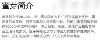 资料显示,蜜芽创立于2011年,是中国女性生活方式服务平台,覆盖业务集零售、自有品牌和会员营销一体。目前,蜜芽已服务超过5000万中国年轻妈妈,满足母婴、家庭、生活产品和服务等全生活场景需求。
